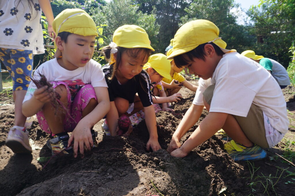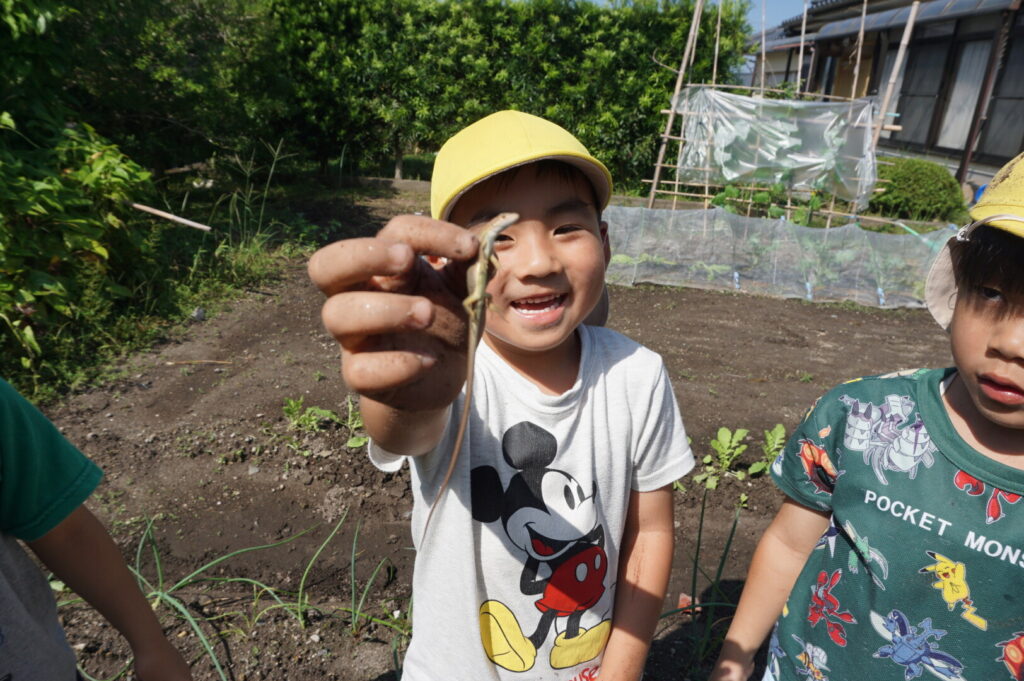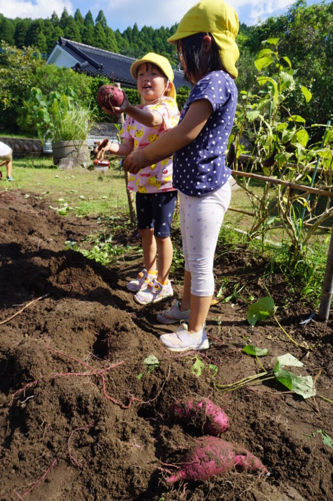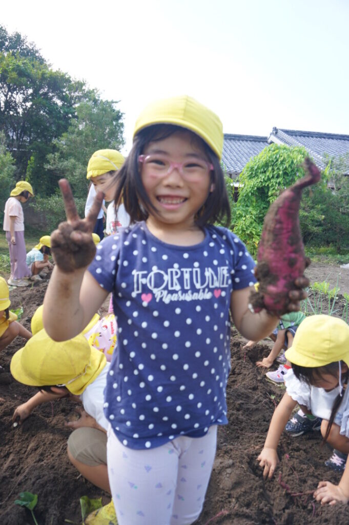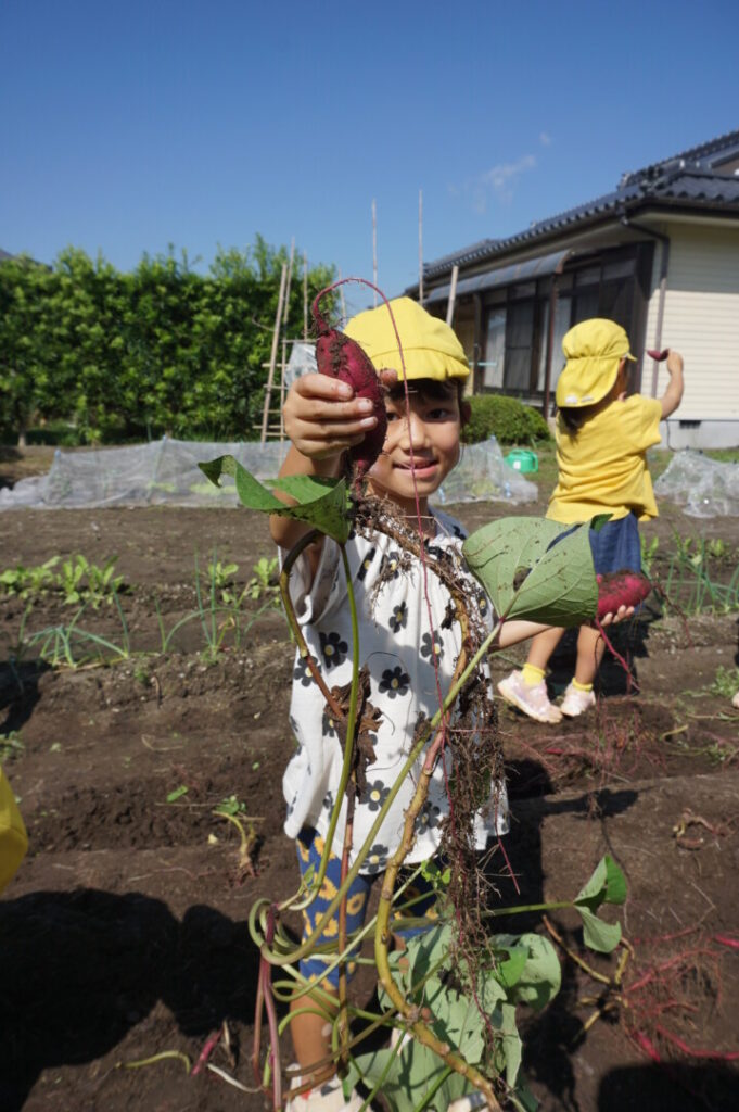 ひまわり組 いもほり体験 2025/10/2 2025年10月7日 前田のおじちゃんから「お芋ほりにおいで」と声がかかり、ひまわり組でお芋ほりに出かけました。前田のおじちゃんの行き届いた管理のおかげで、頭より大きなサツマイモを掘ることができました。畑には、イモムシやムカデ、カマキリやカナヘビなどの生き物もたくさん。芋も掘らなきゃいけないし、虫も捕まえなきゃいけないし、忙しいひまわり組さんでした。なんのお料理になるのか楽しみです。前田のおじちゃんいつもありがとうございます。