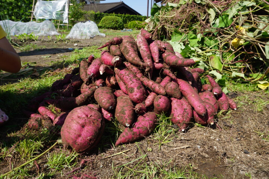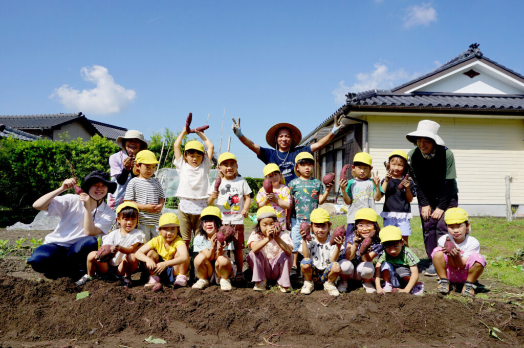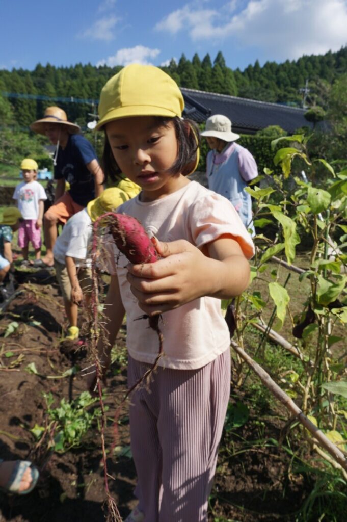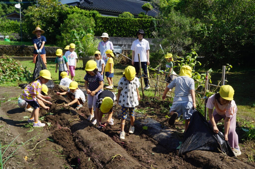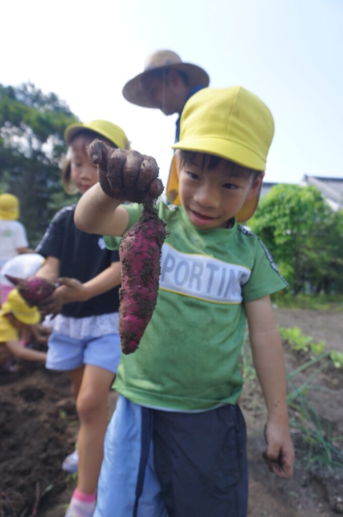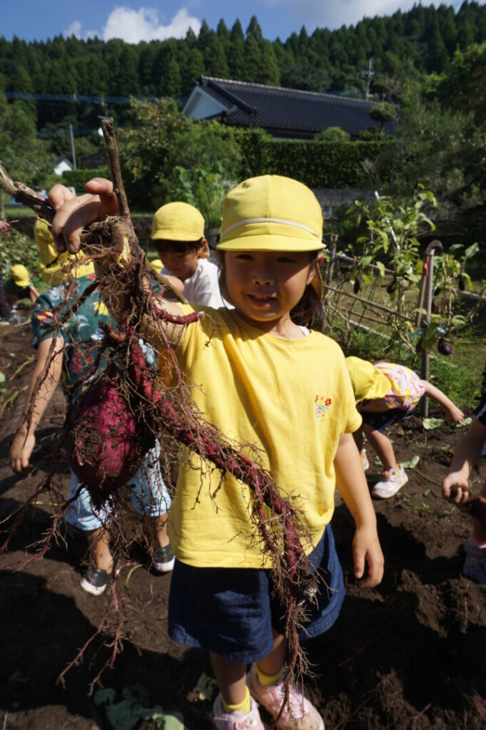 ひまわり組 いもほり体験 2025/10/2 2025年10月7日 前田のおじちゃんから「お芋ほりにおいで」と声がかかり、ひまわり組でお芋ほりに出かけました。前田のおじちゃんの行き届いた管理のおかげで、頭より大きなサツマイモを掘ることができました。畑には、イモムシやムカデ、カマキリやカナヘビなどの生き物もたくさん。芋も掘らなきゃいけないし、虫も捕まえなきゃいけないし、忙しいひまわり組さんでした。なんのお料理になるのか楽しみです。前田のおじちゃんいつもありがとうございます。