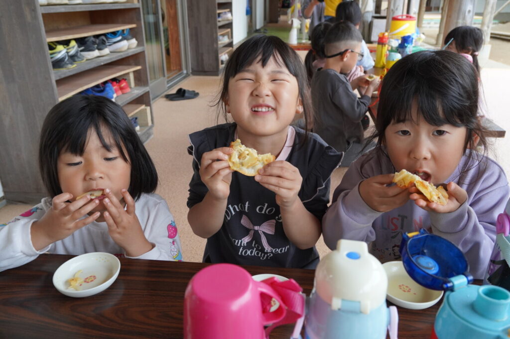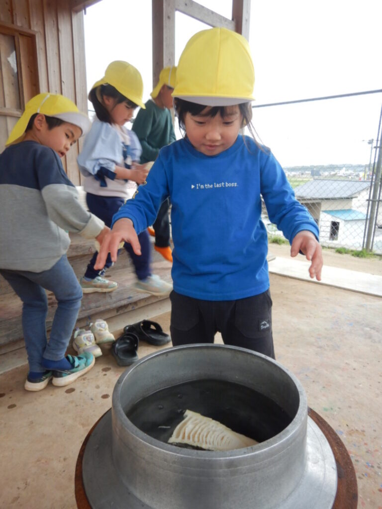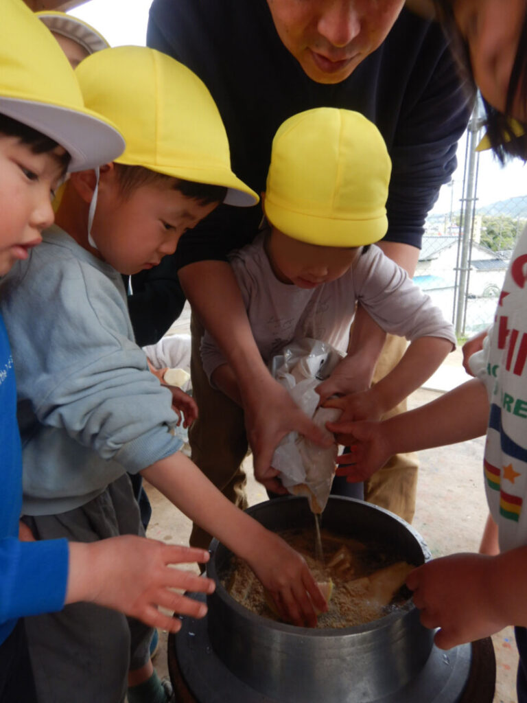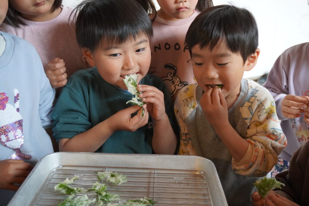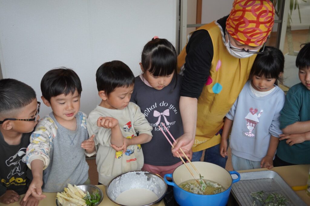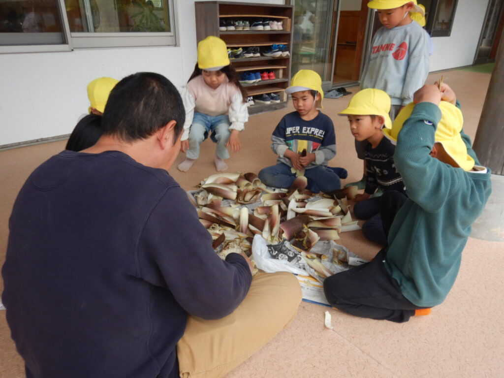 卒園児のお兄ちゃんが掘ってきてくれたタケノコを調理しました。皮を剥いて、羽釜で炊きました。炊きあがったタケノコを、給食の先生が目の前でてんぷらにしてくれたり、新玉とそら豆とタケノコとよもぎのかき揚げも食べました。ひまわり組は自分たちでタケノコ入りのピザも作って食べました。タケノコを掘ってきてくれたお兄ちゃんにもピザを作ってあげたところ、照れくさそうに「おいしかったよ」と答えてくれました。春を五官を通して感じる体験ができ、素敵な一日になりました。春、本当においしかったです。それにしても、今年はタケノコがよく出てます。