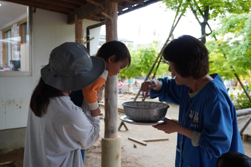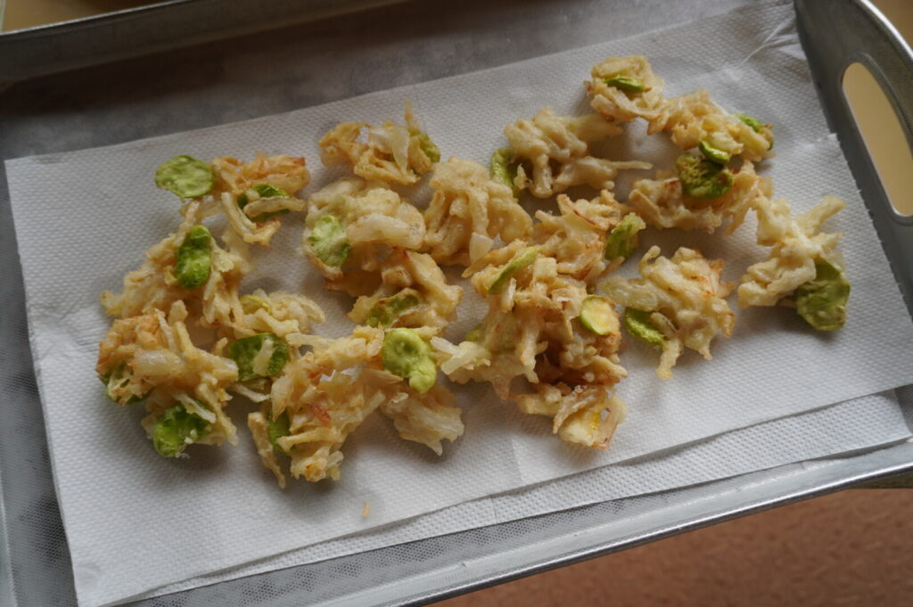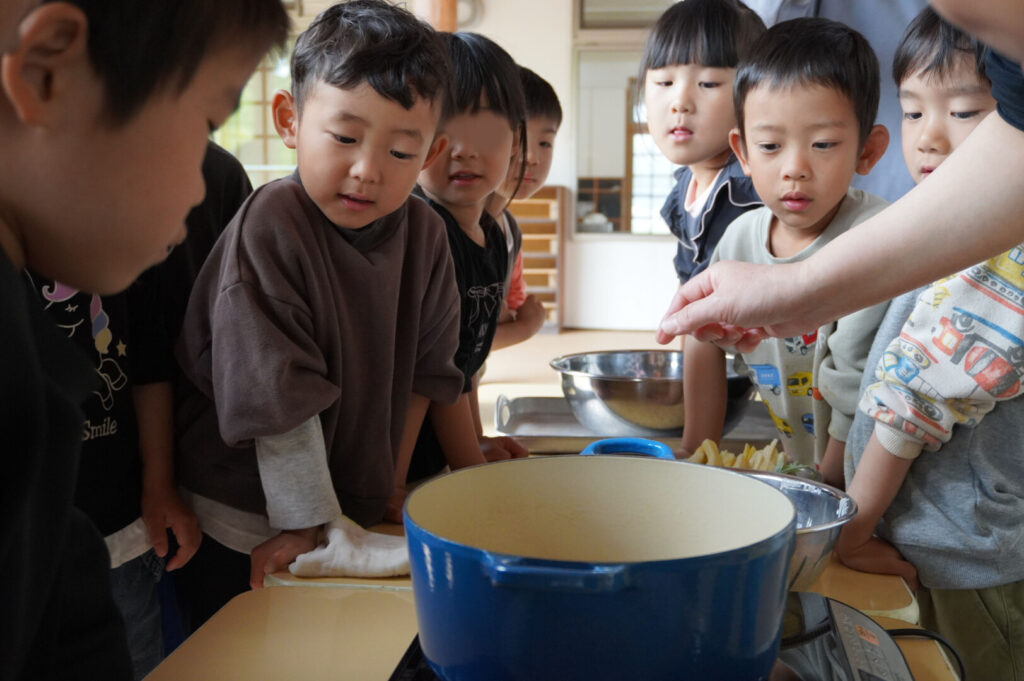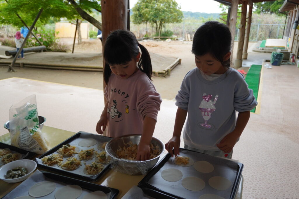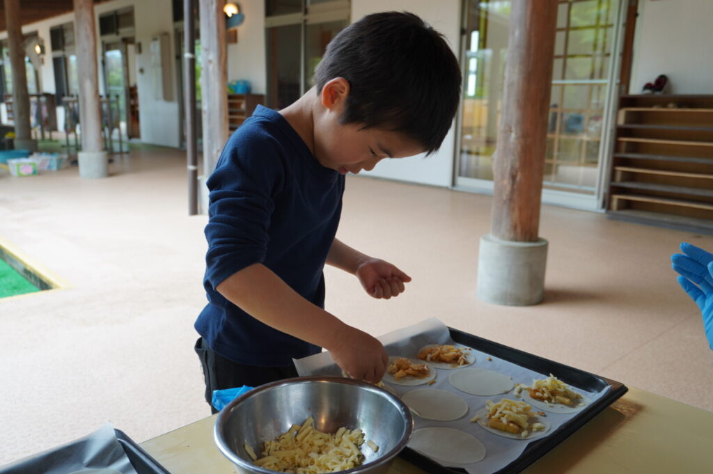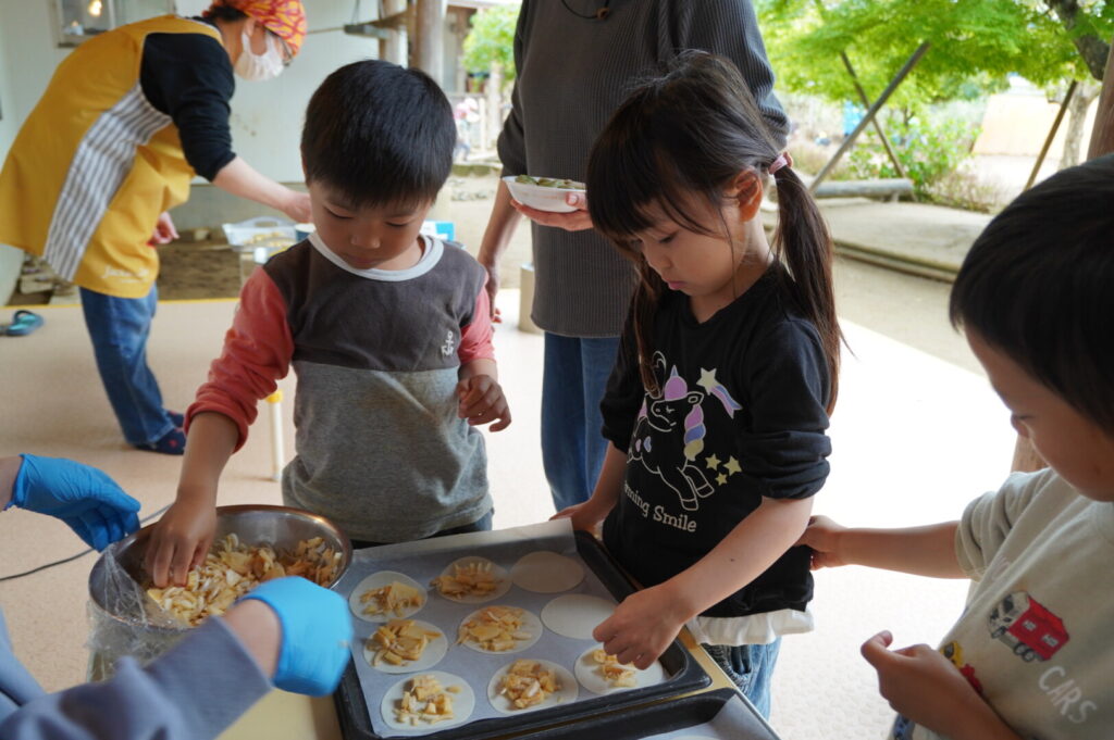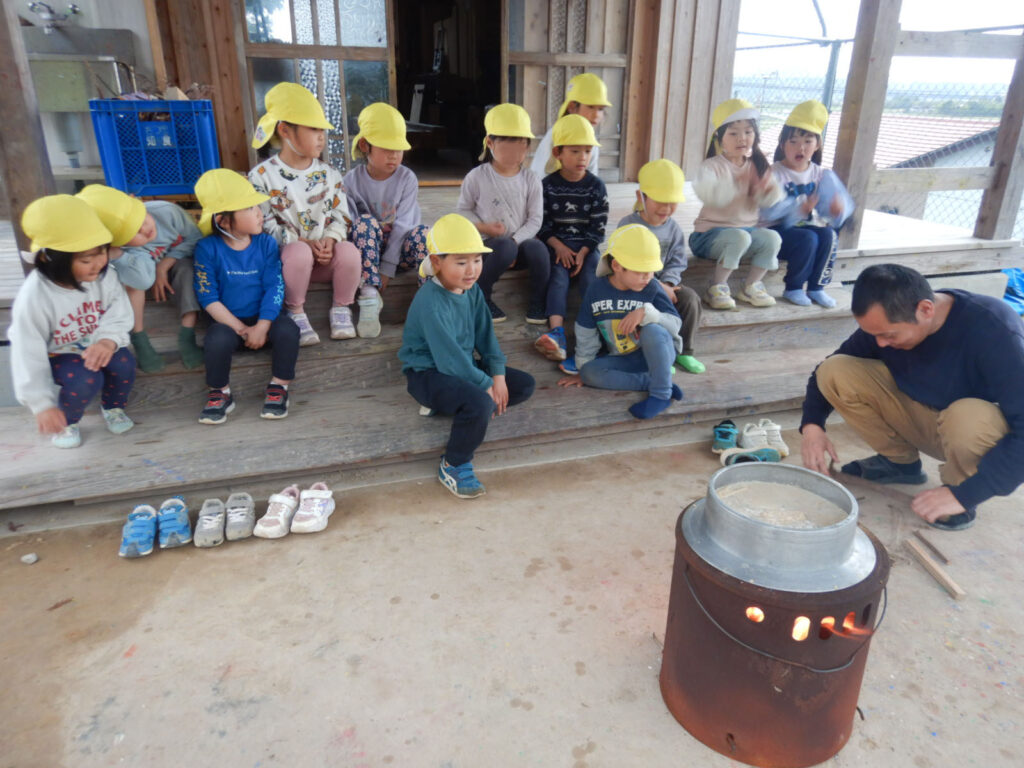 卒園児のお兄ちゃんが掘ってきてくれたタケノコを調理しました。皮を剥いて、羽釜で炊きました。炊きあがったタケノコを、給食の先生が目の前でてんぷらにしてくれたり、新玉とそら豆とタケノコとよもぎのかき揚げも食べました。ひまわり組は自分たちでタケノコ入りのピザも作って食べました。タケノコを掘ってきてくれたお兄ちゃんにもピザを作ってあげたところ、照れくさそうに「おいしかったよ」と答えてくれました。春を五官を通して感じる体験ができ、素敵な一日になりました。春、本当においしかったです。それにしても、今年はタケノコがよく出てます。