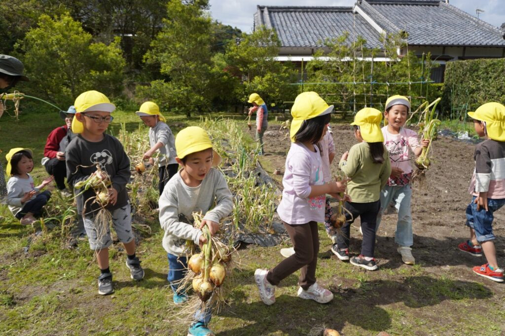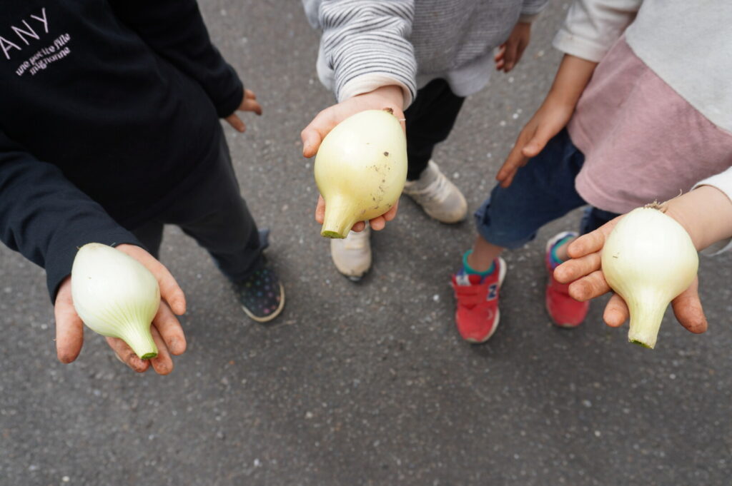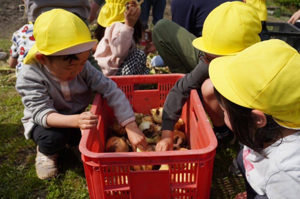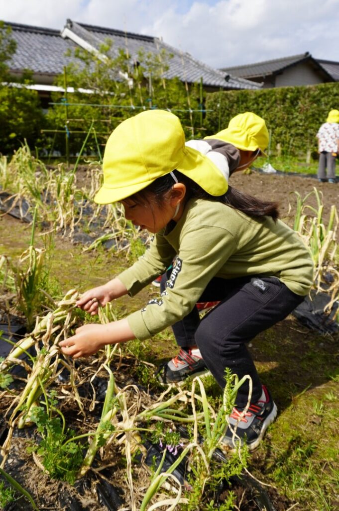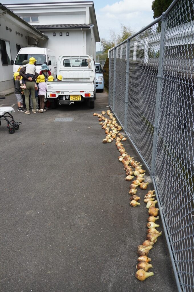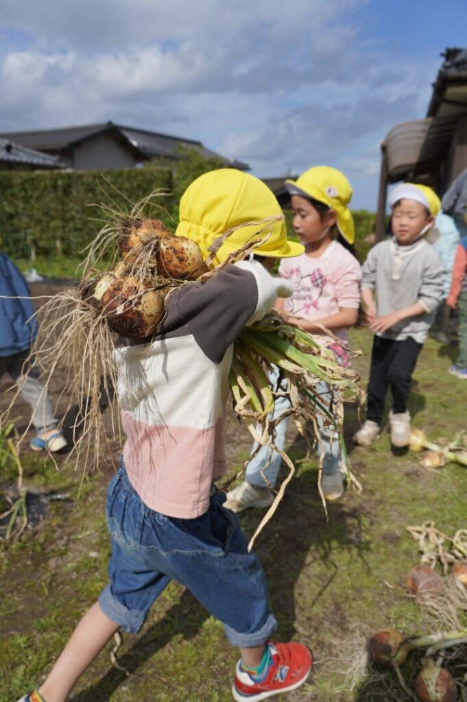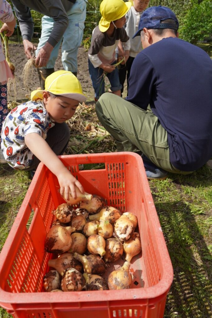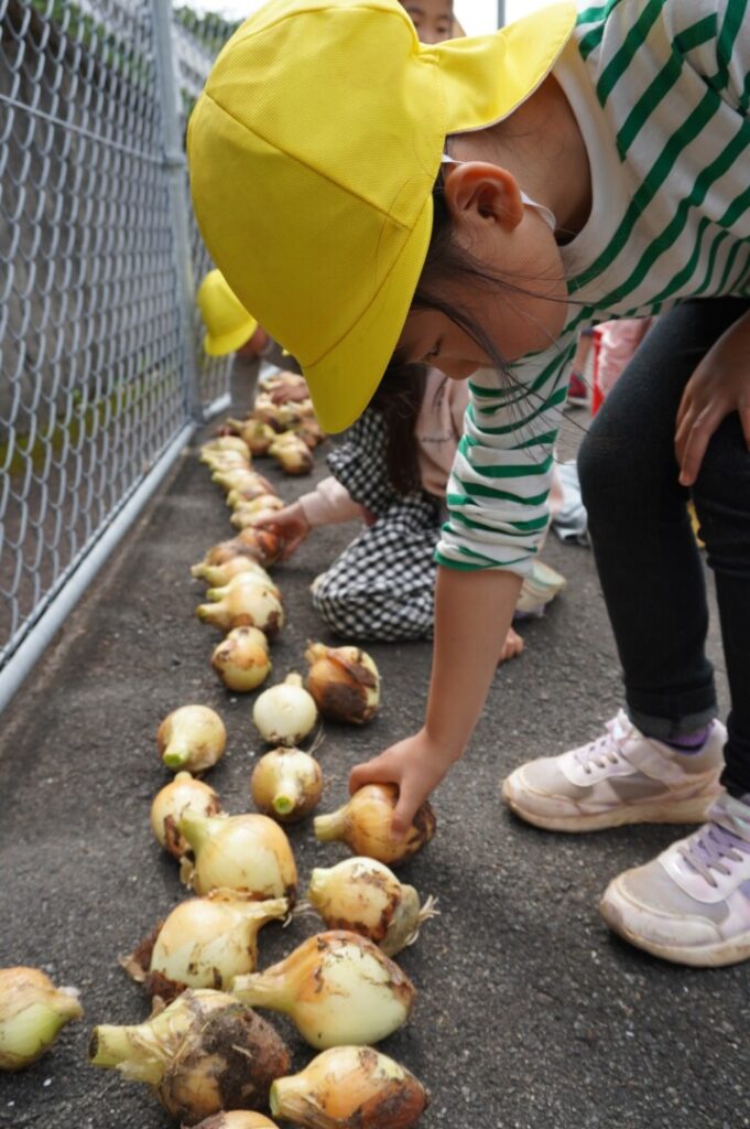 ひまわり組 玉ねぎ収穫 2017/4/17 2026年4月19日 昨年10月に前田のおじちゃんと植えた玉ねぎを収穫をしました。大きく育った玉ねぎがすぽすぽ気持ちよく抜け子どもたちは大喜びでした。100個を超える収穫に大満足でした。帰って自分たちで並べて干す作業や新玉のオーブン焼きも楽しみました。給食で食すと「おいしーい」と喜ぶ子どもたちでした。
