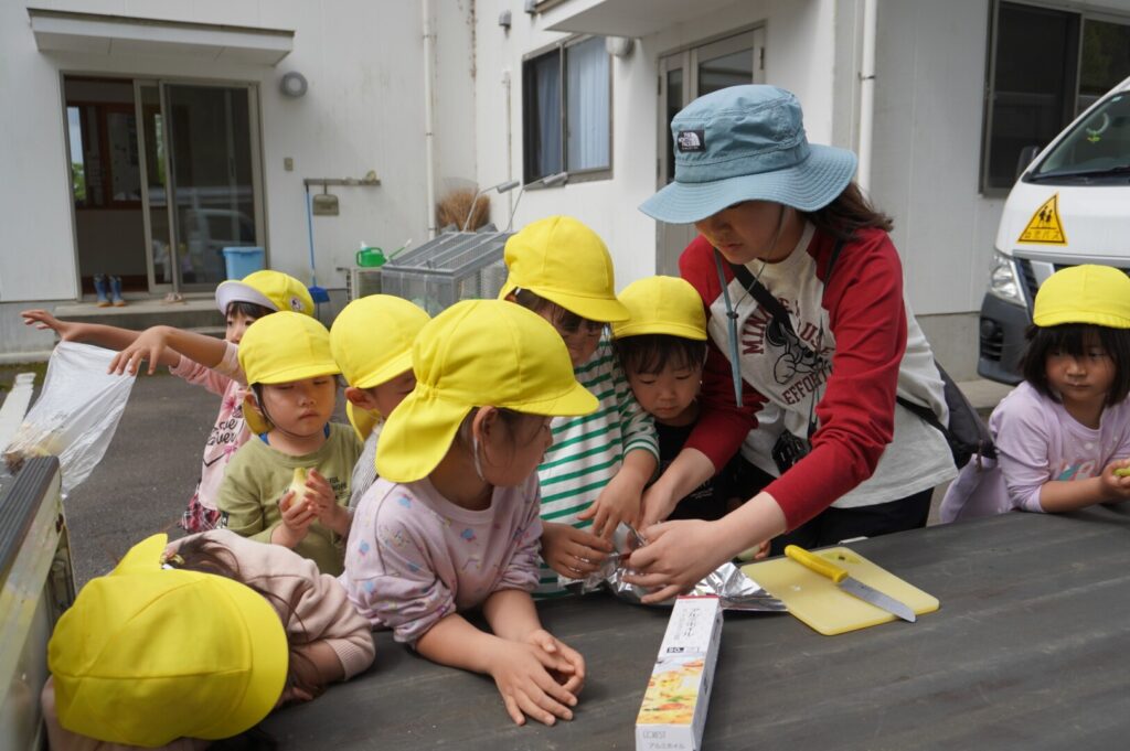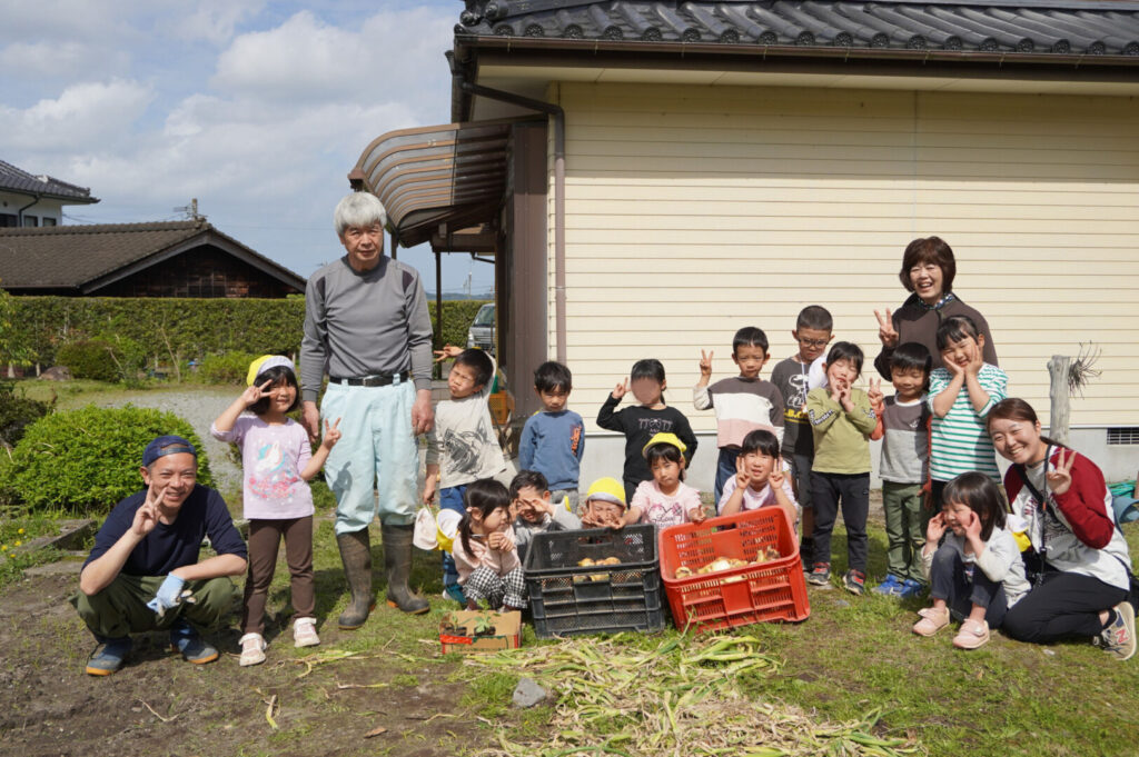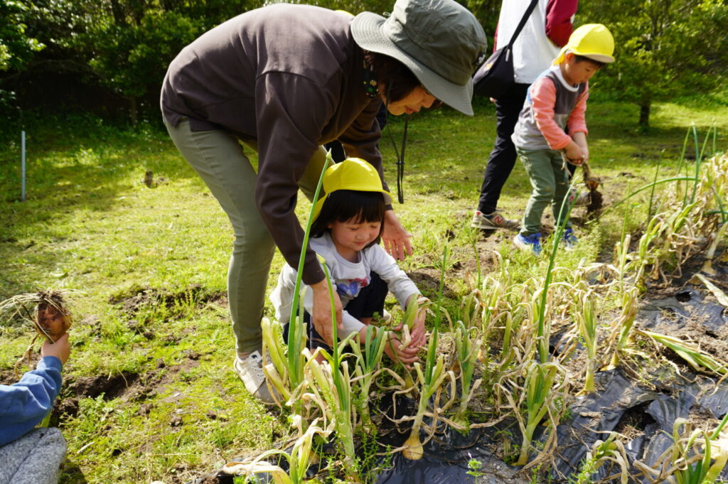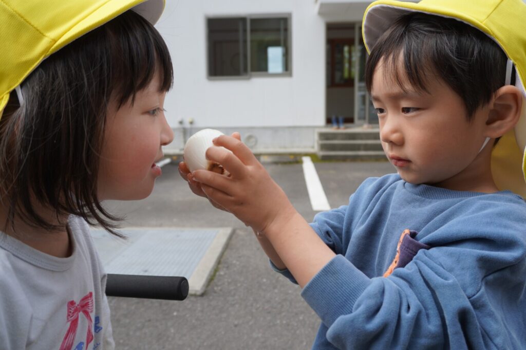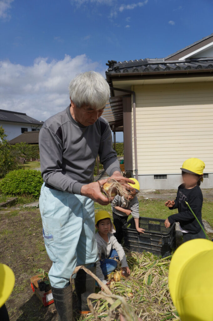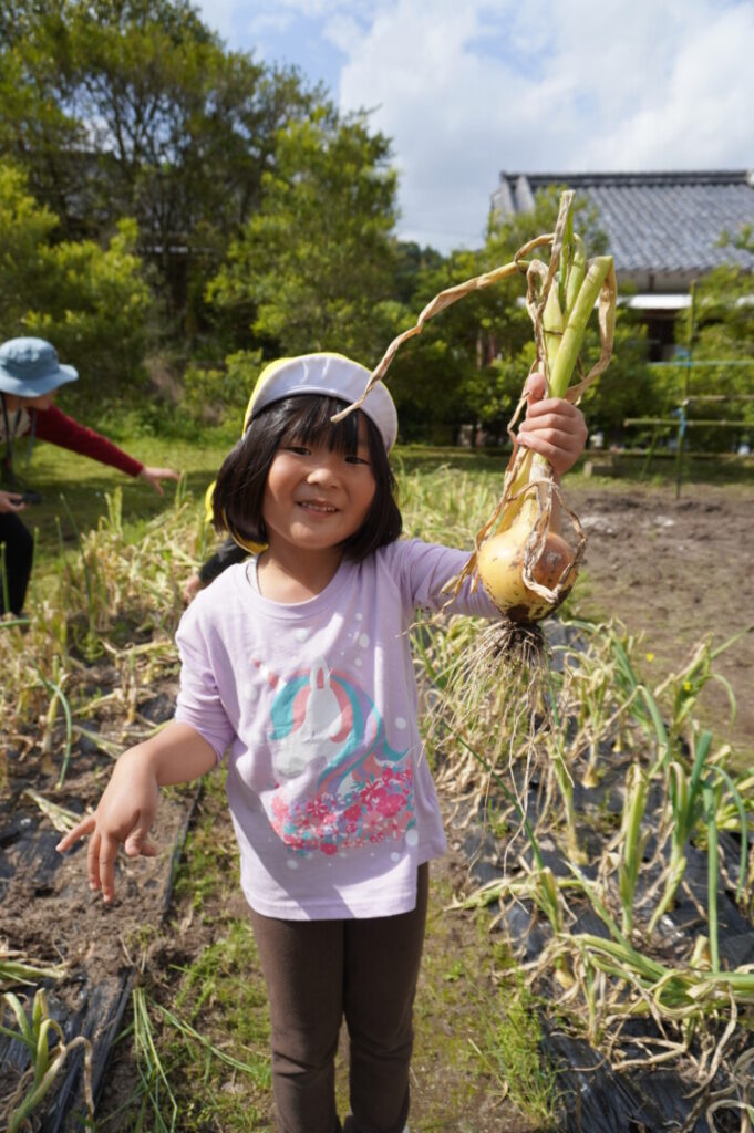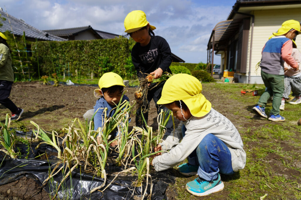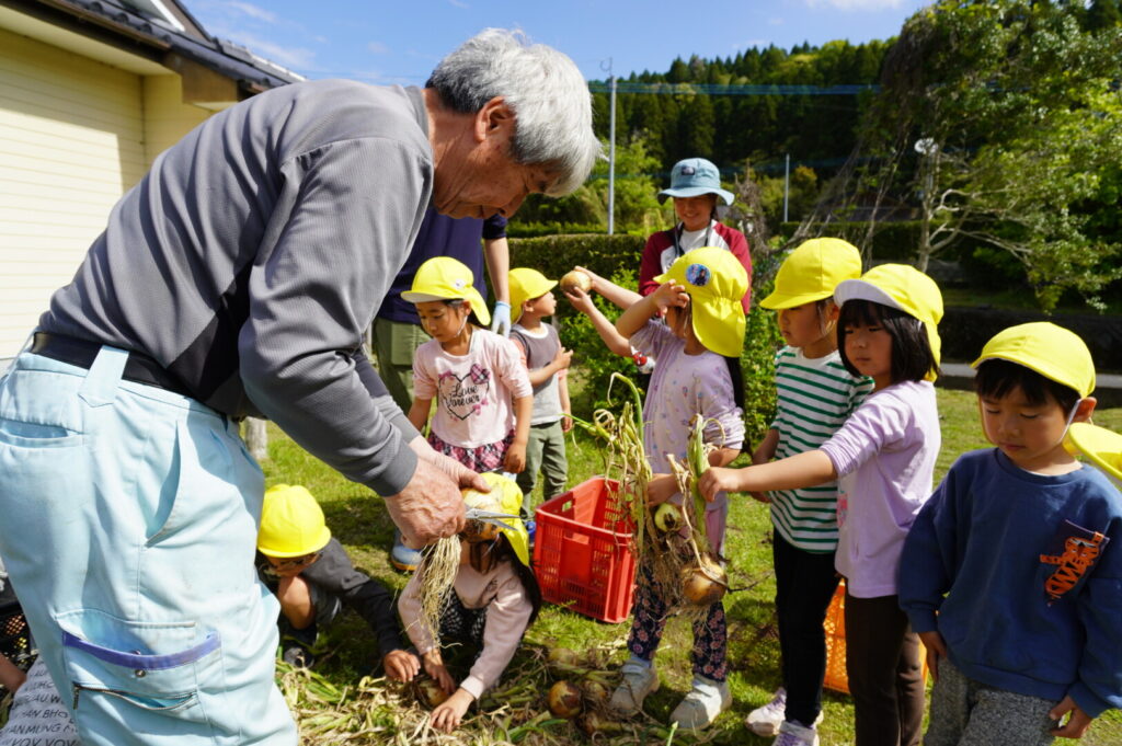 ひまわり組 玉ねぎ収穫 2017/4/17 2026年4月19日 昨年10月に前田のおじちゃんと植えた玉ねぎを収穫をしました。大きく育った玉ねぎがすぽすぽ気持ちよく抜け子どもたちは大喜びでした。100個を超える収穫に大満足でした。帰って自分たちで並べて干す作業や新玉のオーブン焼きも楽しみました。給食で食すと「おいしーい」と喜ぶ子どもたちでした。